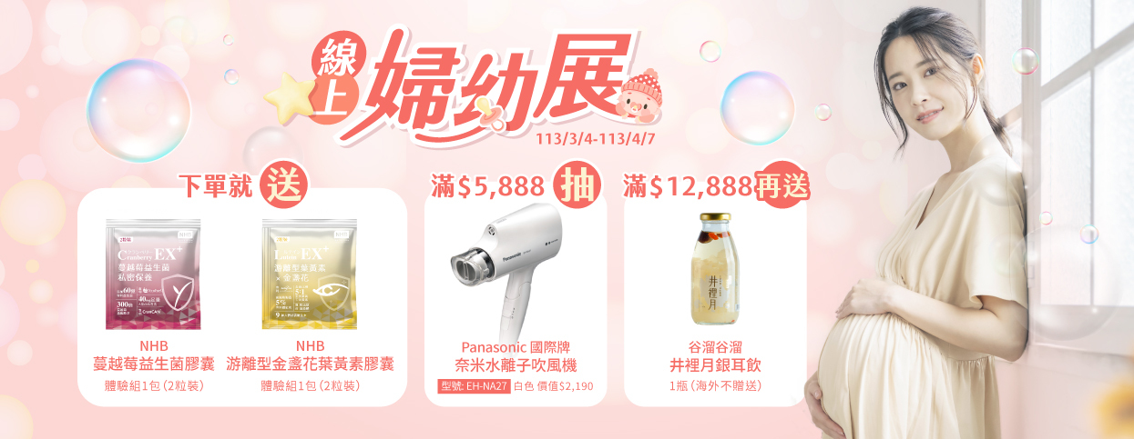 範例 :消費金額滿$12,888,即可抽Panasonic 國際牌 奈米水離子吹風機1台、獲得蔓越莓體驗組*1和葉黃素體驗組*1和谷溜井裡月一瓶