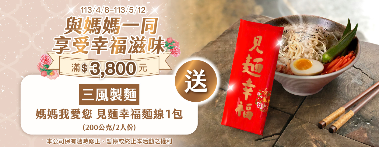 見麵系列的好味道,傳承自古早的白麵線,看似簡簡單單,作工卻極講究!調和獨家比例的食鹽和水,進行均勻和麵、揉麵後,九道延壓製成麵帶,再細細分條,最後經三段式溫度、濕度控制的乾燥化,細如髪絲又根根分明的麵線,才淡淡飄香完成!超過10小時以上悉心照料,見麵系列具備手工製麵般質感,因此麵線除了香氣迷人,口感特別細緻滑嫩外還多了一點彈性Q韌!