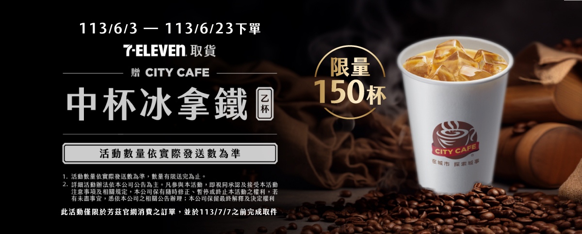 於指定日期 113/7/7 前完成 7-11 超商取貨,即可獲得乙杯 CITY CAFE 冰拿鐵 ( 中杯 )之兌換劵序號。