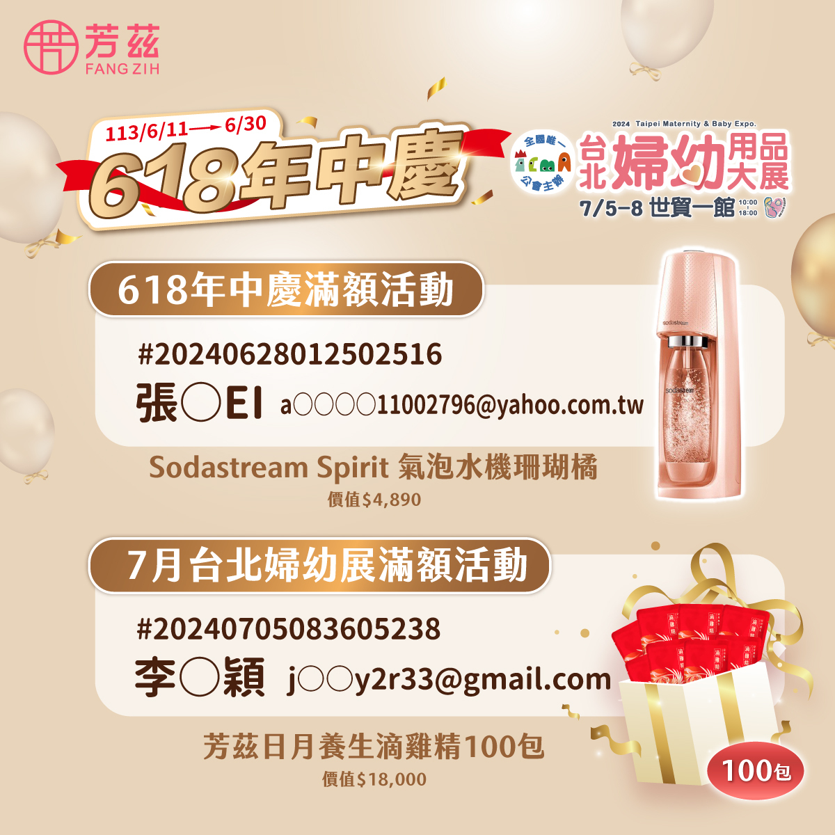 芳茲日月養生滴雞精 100 包 得獎名單 :