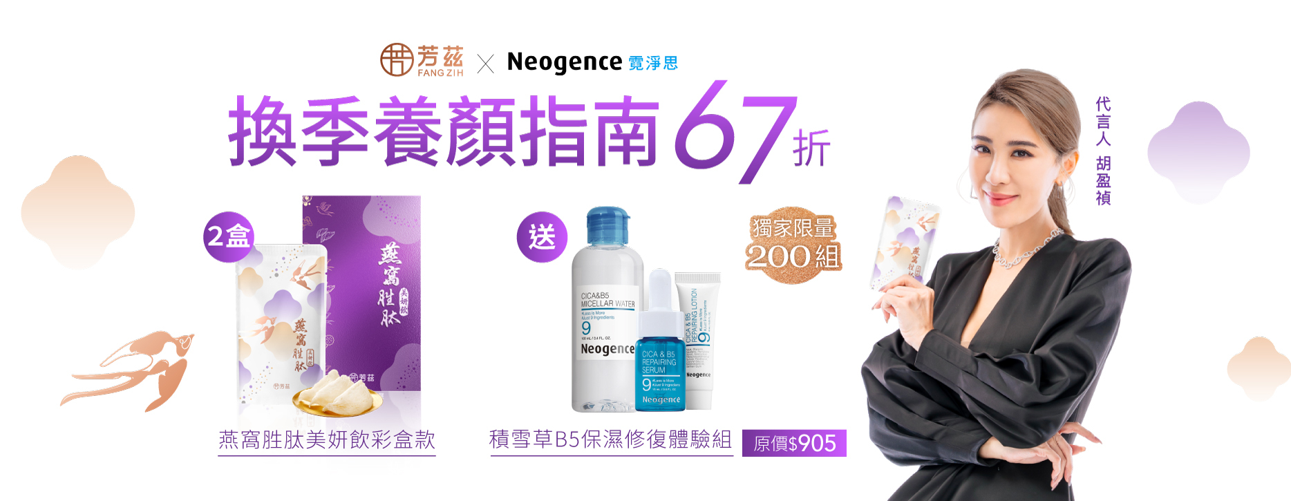 活動期間內,凡於芳茲官網購買「芳茲燕窩胜肽美妍飲」彩盒款2盒,就送「霓淨思積雪草B5保濕修護體驗組」1組 (價值$905),限量200組,送完為止