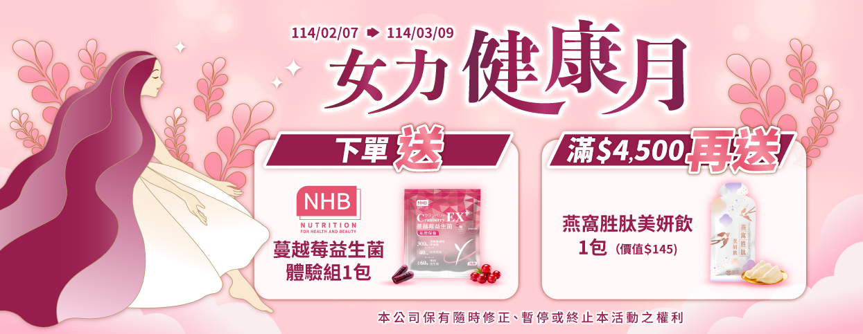 *範例 : 花妞於官網女力健康月完成訂單,且單筆訂單滿$9,000,即可獲得1包蔓越莓益生菌體驗組、燕窩胜肽美妍飲1包 !