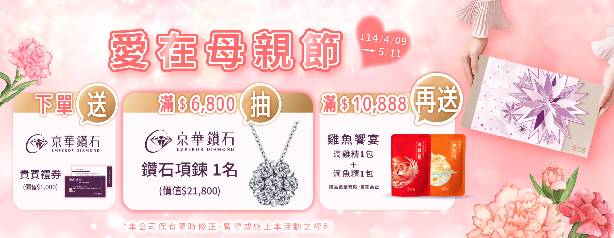 【**凡是官網下單且於114/5/11 (日) 23:59前訂單狀態為【已完成】,單筆訂單消費金額達$6,800,該筆訂單訂購人即自動列入京華鑽石 輕珠寶鑽石項鍊 的抽獎資格中,無須另外登記。】
