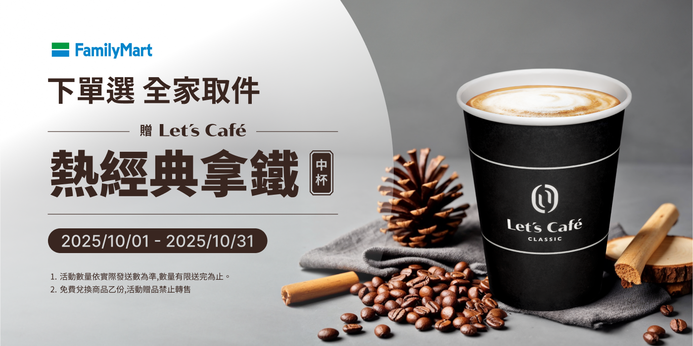 活動期間內 ( 2025 年 10 月 1 日起 至 2025 年 10 月 31 日止 ) 完成下訂並於並於 2025 年 10 月 31 日 23:59 前 在 全家 完成取件者,即享有獲取資格 ( 活動品項 中杯 熱經典拿鐵 乙組 ),贈送對象將於 2025 年 10 月 1 日起 至 2025 年 10 月 31 日止 依實際完成取貨順序發放,因數量有限送完為止,如未獲贈不另通知。