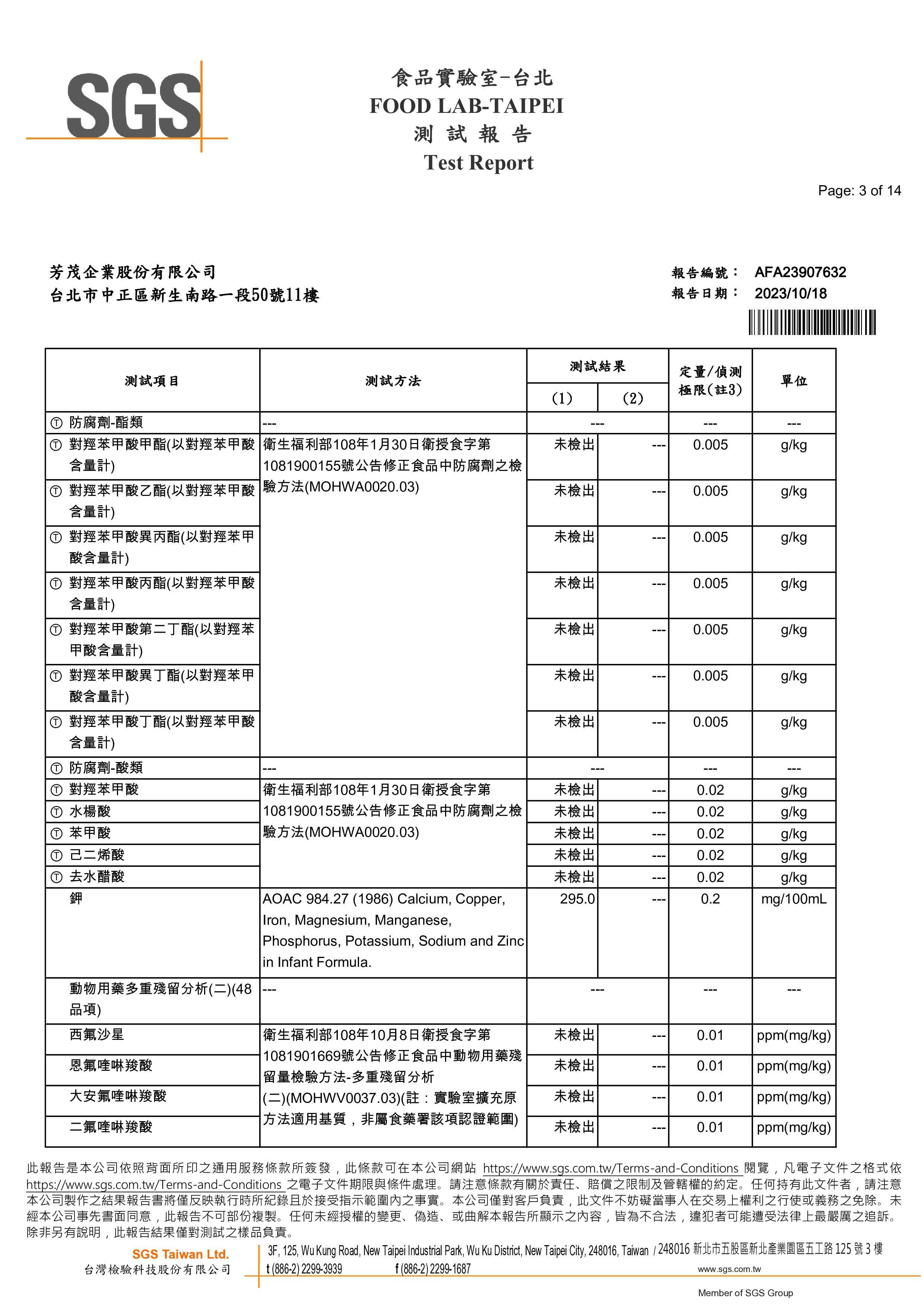 防腐劑、鉀檢測報告