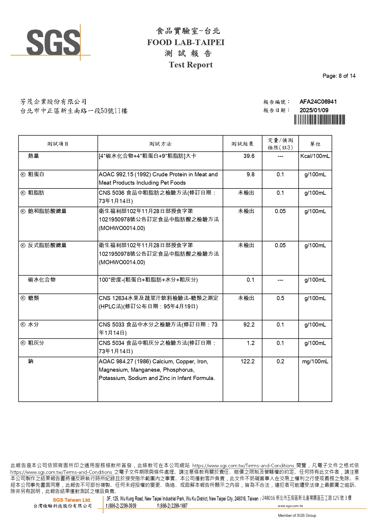 八大營養素、鈉檢測報告