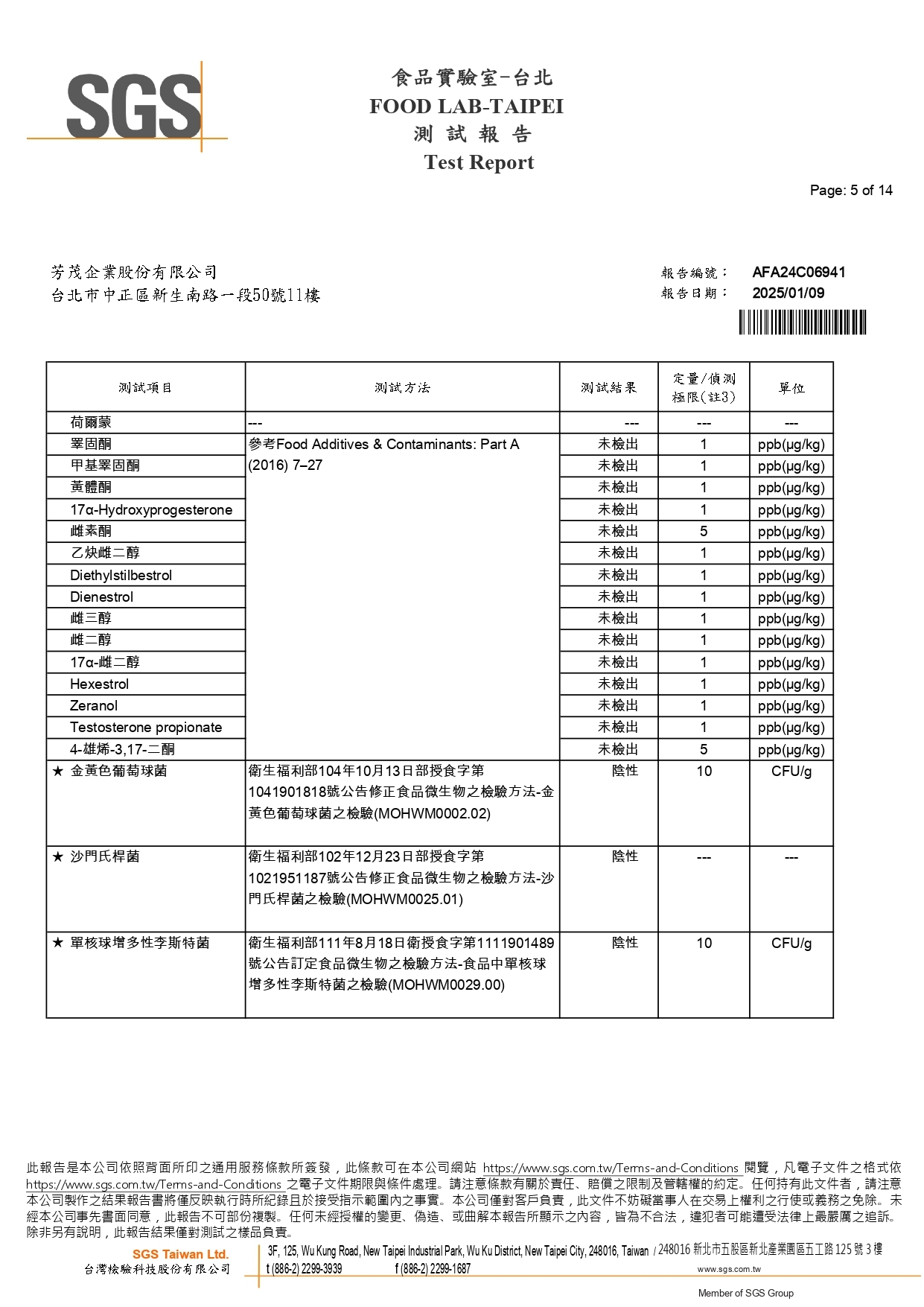 荷爾蒙、微生物檢測報告