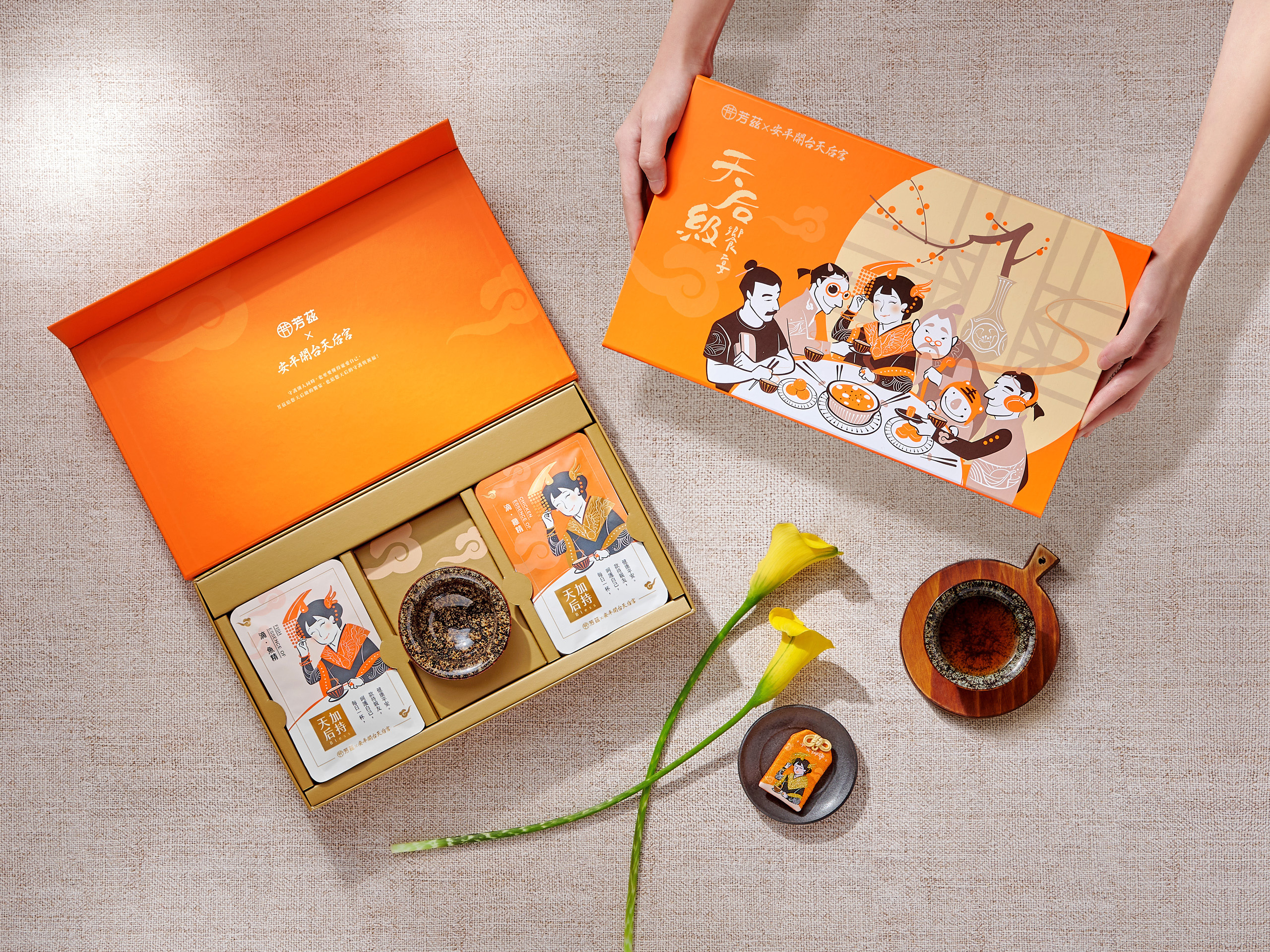 芳茲生技與台南安平開台天后宮攜手打造「天后平安祝福禮盒」,此次與擁有300多年歷史悠久的天后宮聯名,有主神媽祖的庇佑意味帶著祝福平安回家,再搭配明星主打商品日月養生滴雞精和滴魚精,優勢在於可以常溫保存,不會在過年期間冰箱爆滿時佔空間,春節禮盒外盒以象徵大吉大利的金橙色作為底色搭配天后饗宴的主題,象徵媽祖聖請眾神齊聚歡樂饗宴,一同享用如同天上美味的滴雞精與滴魚精,並傳遞最誠摯的祝福。內包裝印製上有別於傳統神明圖像,以手繪插畫風格賦予神明全新樣貌,慈祥福氣的媽祖娘娘與幫助事業順遂的千里眼、財運滾滾來的順風耳,逢考必勝的文昌帝君,再加上今年2022虎年,保佑小孩平安長大的虎爺,一次把多位帶來好運的神明放入禮盒中,還有限量驚喜藏在裡頭,禮盒附贈安平媽祖平安御守,巧奪天工的刺繡工法有著安平開台天后宮過爐加持,讓人時時刻刻帶著御守保平安,加上祈福聖杯精美天目釉品茗杯,別出心裁的設計帶給大家虎來運轉全新的一年。