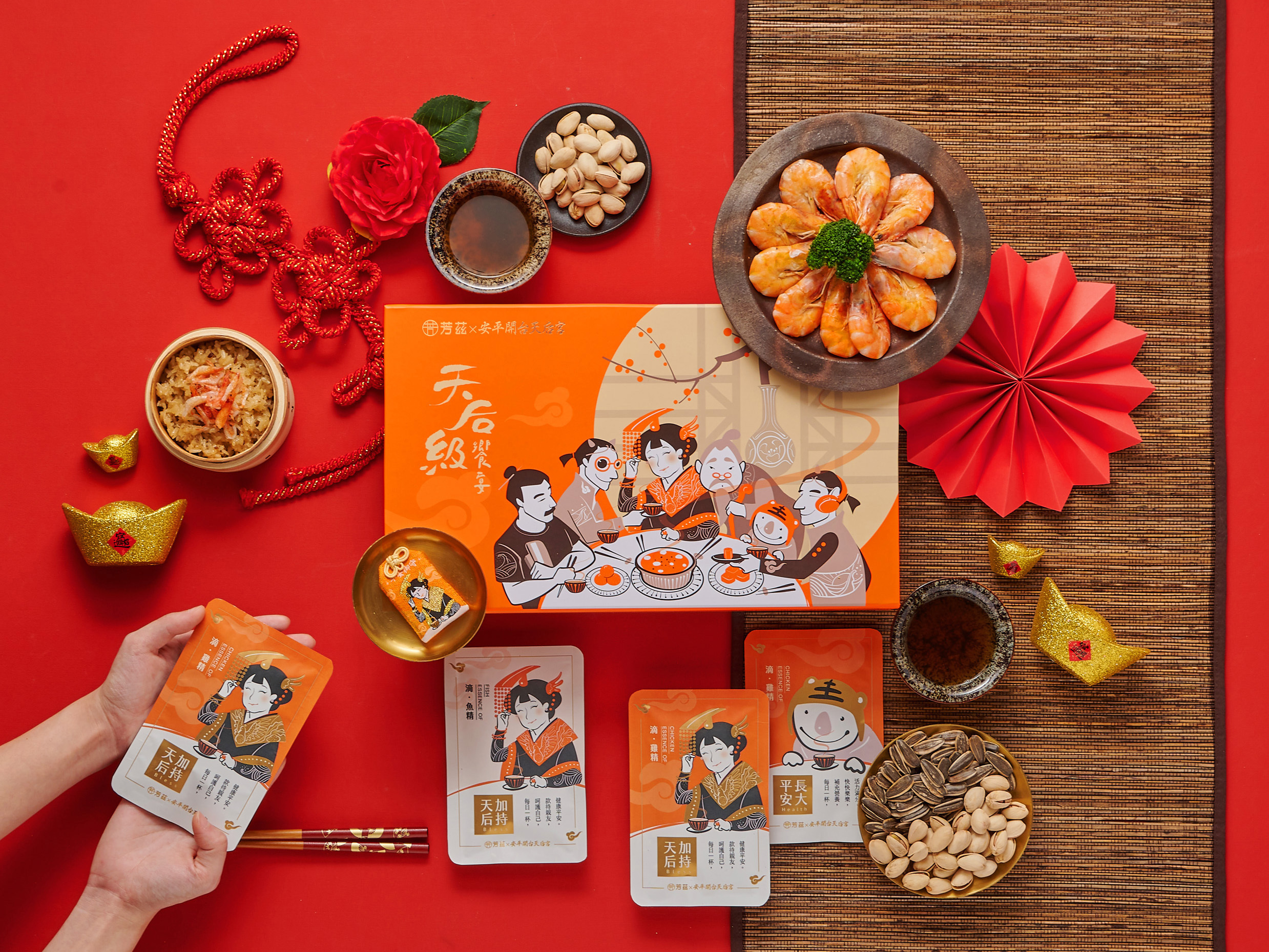 芳茲生技與台南安平開台天后宮攜手打造「天后平安祝福禮盒」,此次與擁有300多年歷史悠久的天后宮聯名,有主神媽祖的庇佑意味帶著祝福平安回家,再搭配明星主打商品日月養生滴雞精和滴魚精,優勢在於可以常溫保存,不會在過年期間冰箱爆滿時佔空間,春節禮盒外盒以象徵大吉大利的金橙色作為底色搭配天后饗宴的主題,象徵媽祖聖請眾神齊聚歡樂饗宴,一同享用如同天上美味的滴雞精與滴魚精,並傳遞最誠摯的祝福。內包裝印製上有別於傳統神明圖像,以手繪插畫風格賦予神明全新樣貌,慈祥福氣的媽祖娘娘與幫助事業順遂的千里眼、財運滾滾來的順風耳,逢考必勝的文昌帝君,再加上今年2022虎年,保佑小孩平安長大的虎爺,一次把多位帶來好運的神明放入禮盒中,還有限量驚喜藏在裡頭,禮盒附贈安平媽祖平安御守,巧奪天工的刺繡工法有著安平開台天后宮過爐加持,讓人時時刻刻帶著御守保平安,加上祈福聖杯精美天目釉品茗杯,別出心裁的設計帶給大家虎來運轉全新的一年。