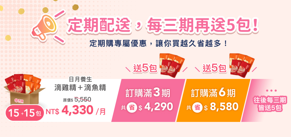 · 每三期贈送 "3包滴魚精+2包滴雞精"